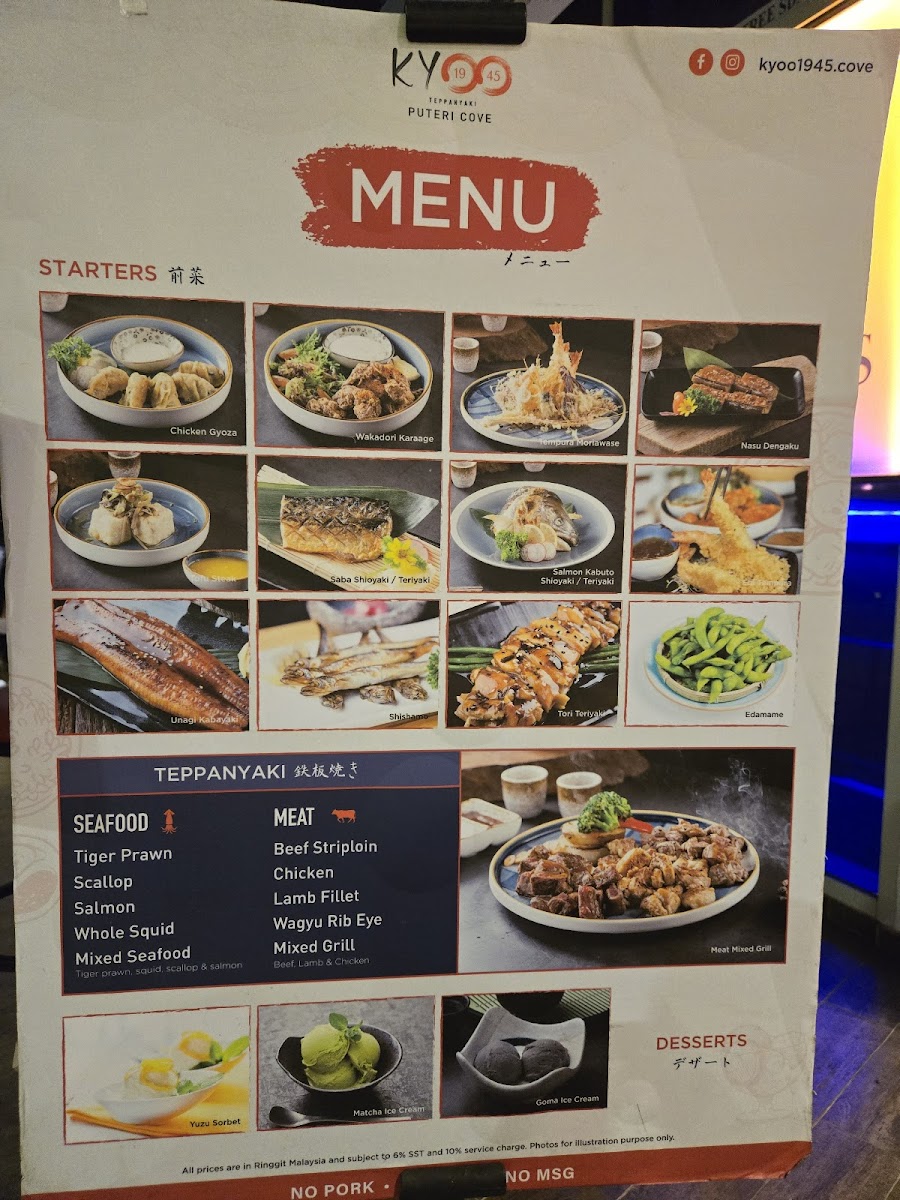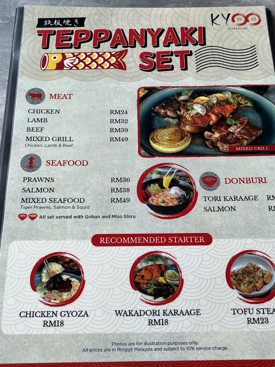 At Kyoo1945 Teppanyaki Puteri Cove (LG2-30, RESIDENSI TELUK PUTERI, JALAN TANJUNG, Puteri Harbour, 79100 Iskandar Puteri, Johor, Malaysia), the menu feels built around satisfying, straightforward Japanese comfort with a clear teppanyaki identity. If you want a complete, hearty experience, the Beef Teppanyaki Set is the obvious anchor-classic, filling, and designed to showcase that hot-plate aroma and sear. Pairing it with Garlic Fried Rice makes total sense: it’s the kind of fragrant, punchy side that pulls the whole table together, especially when you’re mixing proteins. Seafood lovers aren’t left behind either-between the Seafood Platter and Mixed Seafood, the choices lean toward variety and shared-style enjoyment, while lighter balance comes through with the Salmon Salad. For quick, crowd-pleasing bites, Chicken Gyoza is a dependable starter, and Bean Sprout adds a clean, simple contrast to richer plates. Chicken options are plentiful and easy to like, from Chicken Teriyaki to Grilled Chicken, while rice-bowl comfort shows up in Karaage Donburi-crispy, satisfying, and very much an “order it and you’re set” kind of dish. If you’re dining with a group or simply want maximum variety in one go, Mixed Grill Beef Lamb Chicken delivers a bold mix of flavors, and Tofu Steak is a smart alternative for something still savory but less heavy. The overall experience is also tied to the teppanyaki theatre-Chef Cutting the Meat underscores that the menu isn’t just about what you eat, but how it’s presented, giving the meal a more interactive, made-for-the-moment feel.